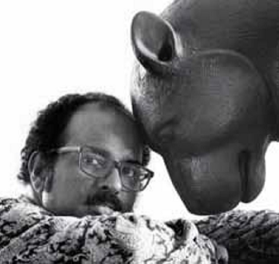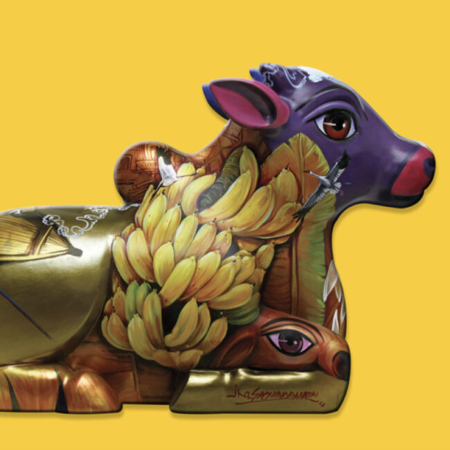B the vicious circle of death and rebirth.right yellow, deep colours of the earth are a hallmark of Sachindranath Jha’s art. When I look at Sachindranath’s sculptures and photographs I am pulled back into the traditional culture, particularly of North India where the Ganga literally lives in every home. In traditional Indian homes, Gangajal or ‘holy water’ is integral, be it in a small glass bottle or a plastic jerry can. No self-respecting Hindu would ever be found without a few drops of Gangajal in their homes. Post-independent India saw large extended families where rituals and puja were part of the everyday as was the sweet white milky concoction of milk, ghee, dahi, shahad honey and the most important, a few drops of Gangajal to make an otherwise sweet mixture into the divine prasad called Charnamrit. Belonging to a traditional Brahminical family from the Madhubani district in Bihar Sachindranath Jha is deeply connected to the land of his ancestors where the sacred river Ganga is part of his consciousness. Naturally, he named his solo exhibition Charnamrit. I too saw a deep connection in the word. From the sacred portion to the five elements of his exhibition where there is sculpture, painting, photographs, installations and performance. The five strands of his work for me became the five ingredients of Charnamrit, with the Ganga as the powerful catalyst.